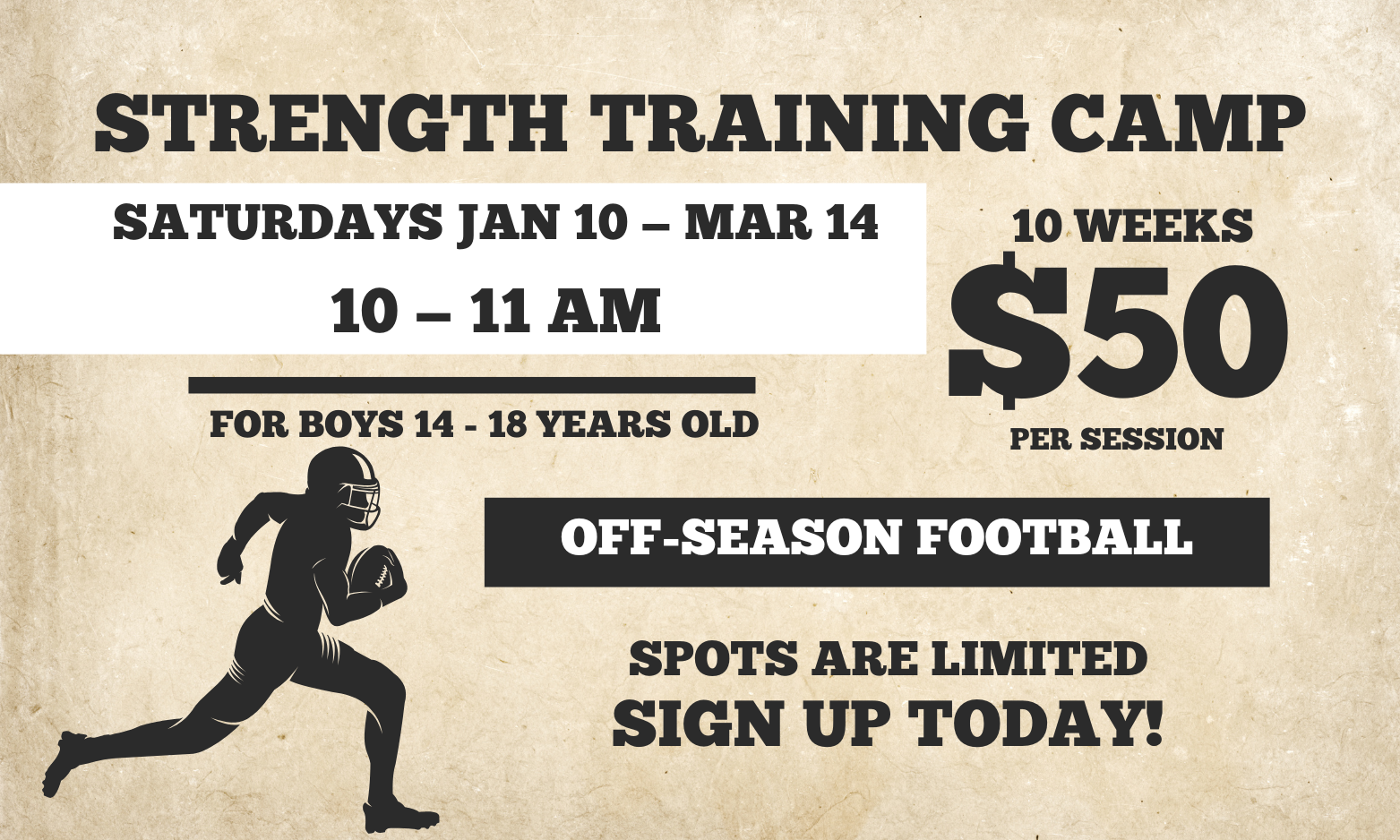 10-week off-season program to build speed, power, and confidence for next season. Improve strength, agility, and endurance while reducing injury risk. Get stronger, faster, and more explosive.